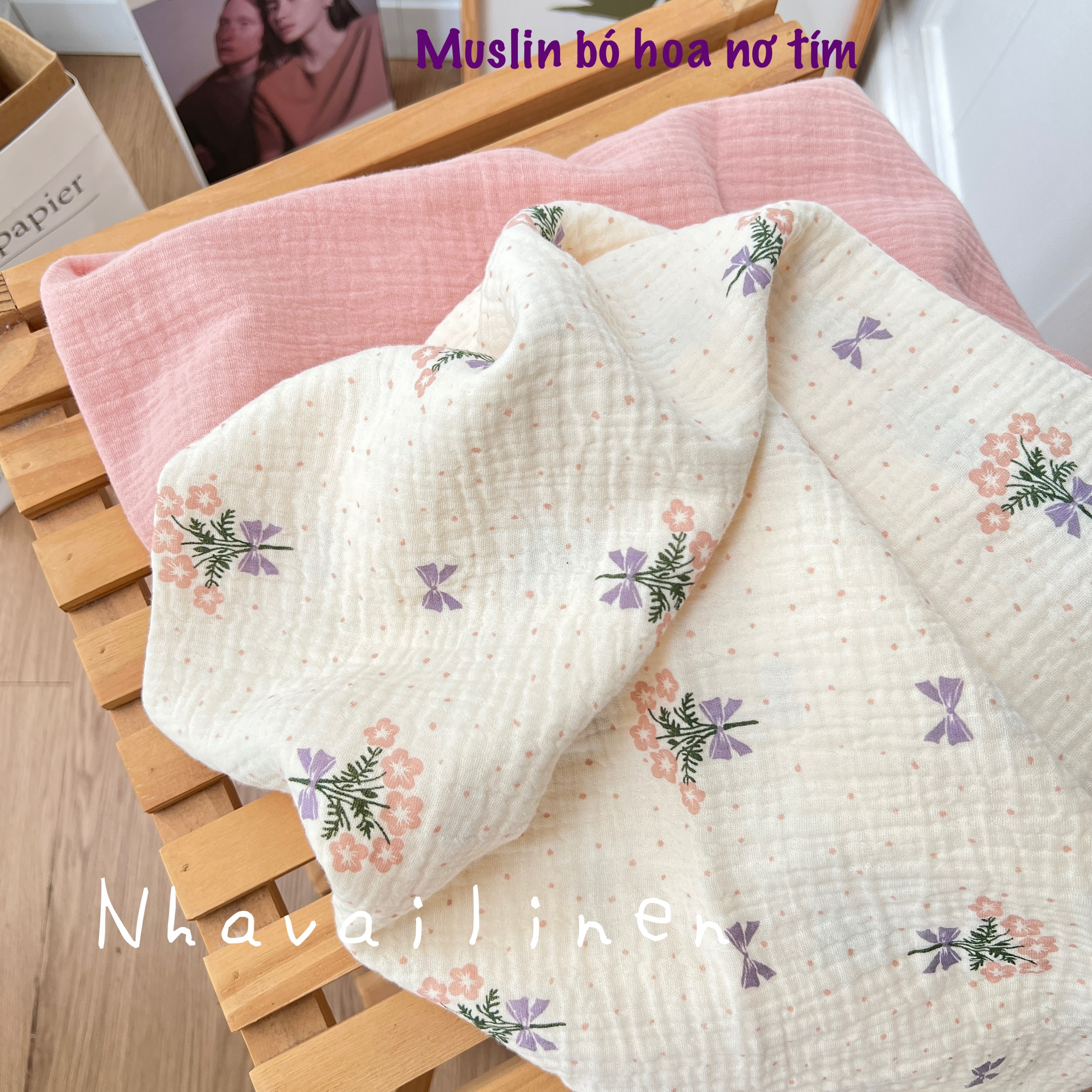 - Chất liệu: Vải Muslin được làm từ sợi cotton tự nhiên.