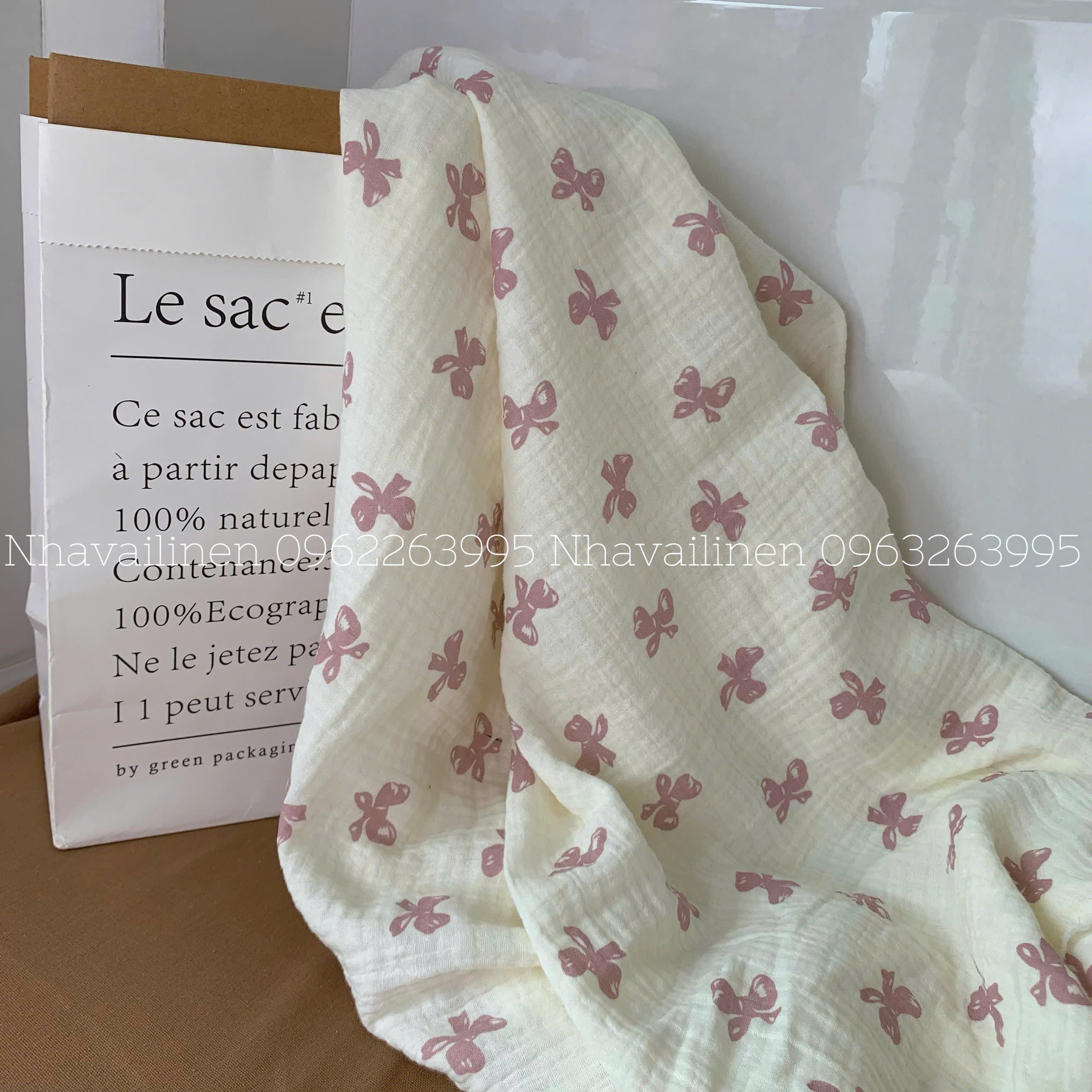 Xô muslin cao cấp 2 lớp hoạ tiết nơ hồng