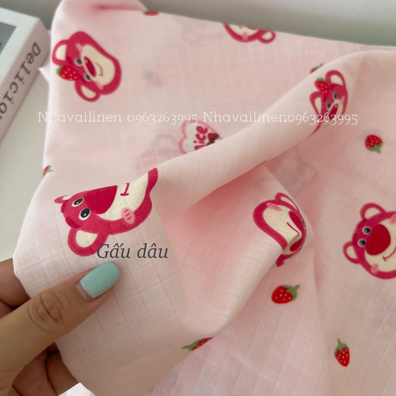 Vải xô ô vuông organic hoạ tiết gấu dâu