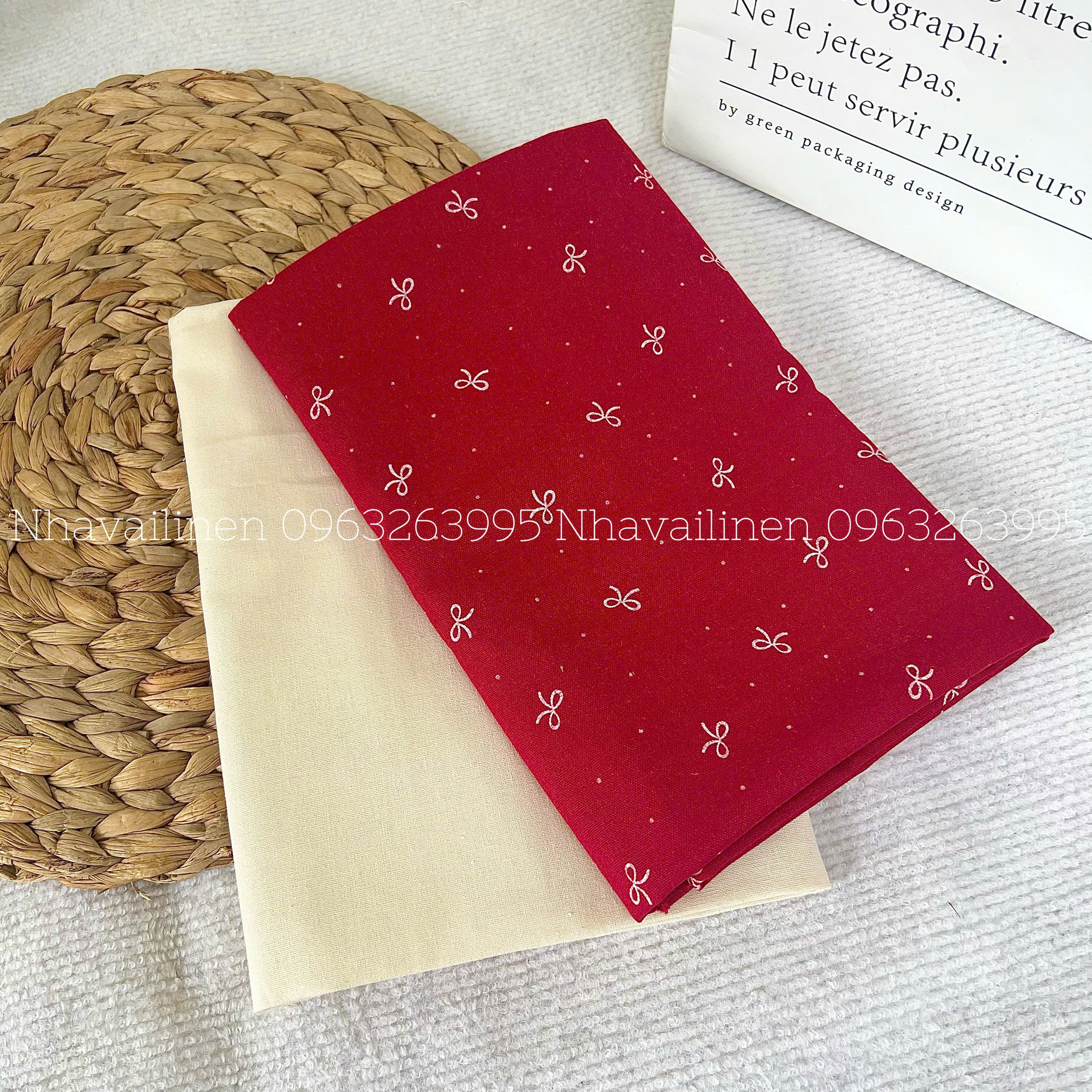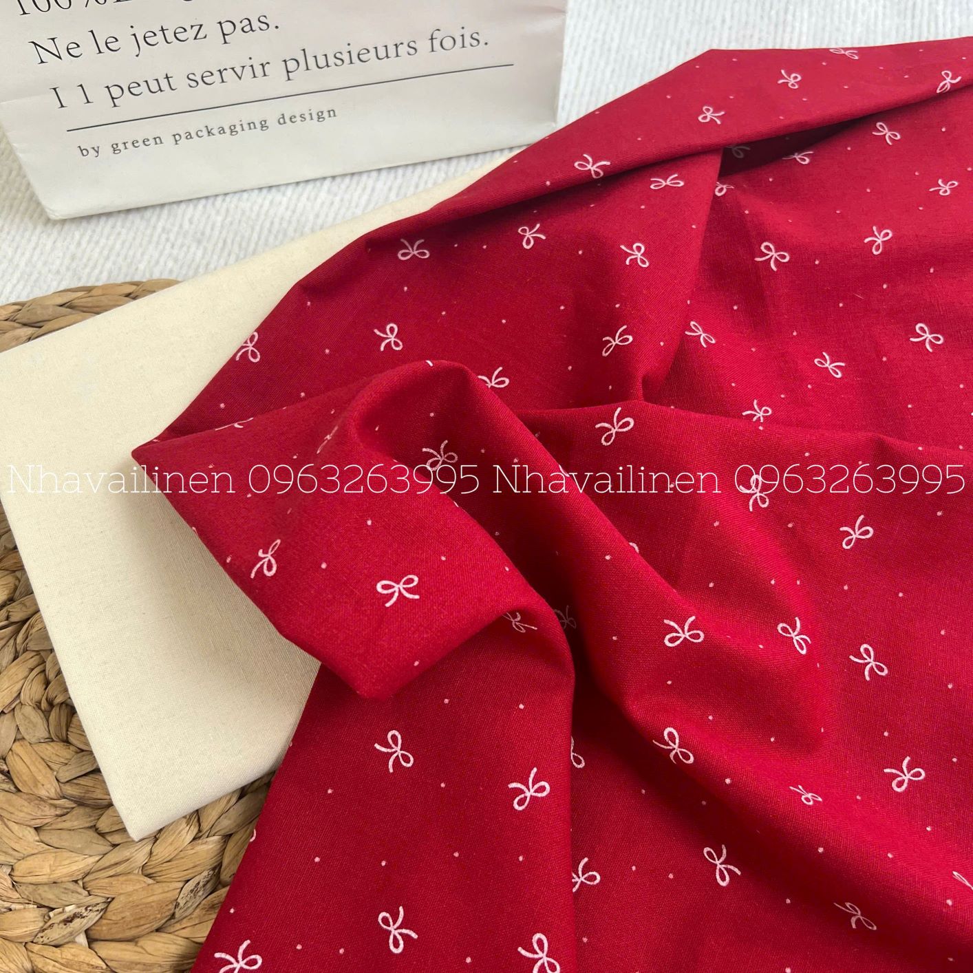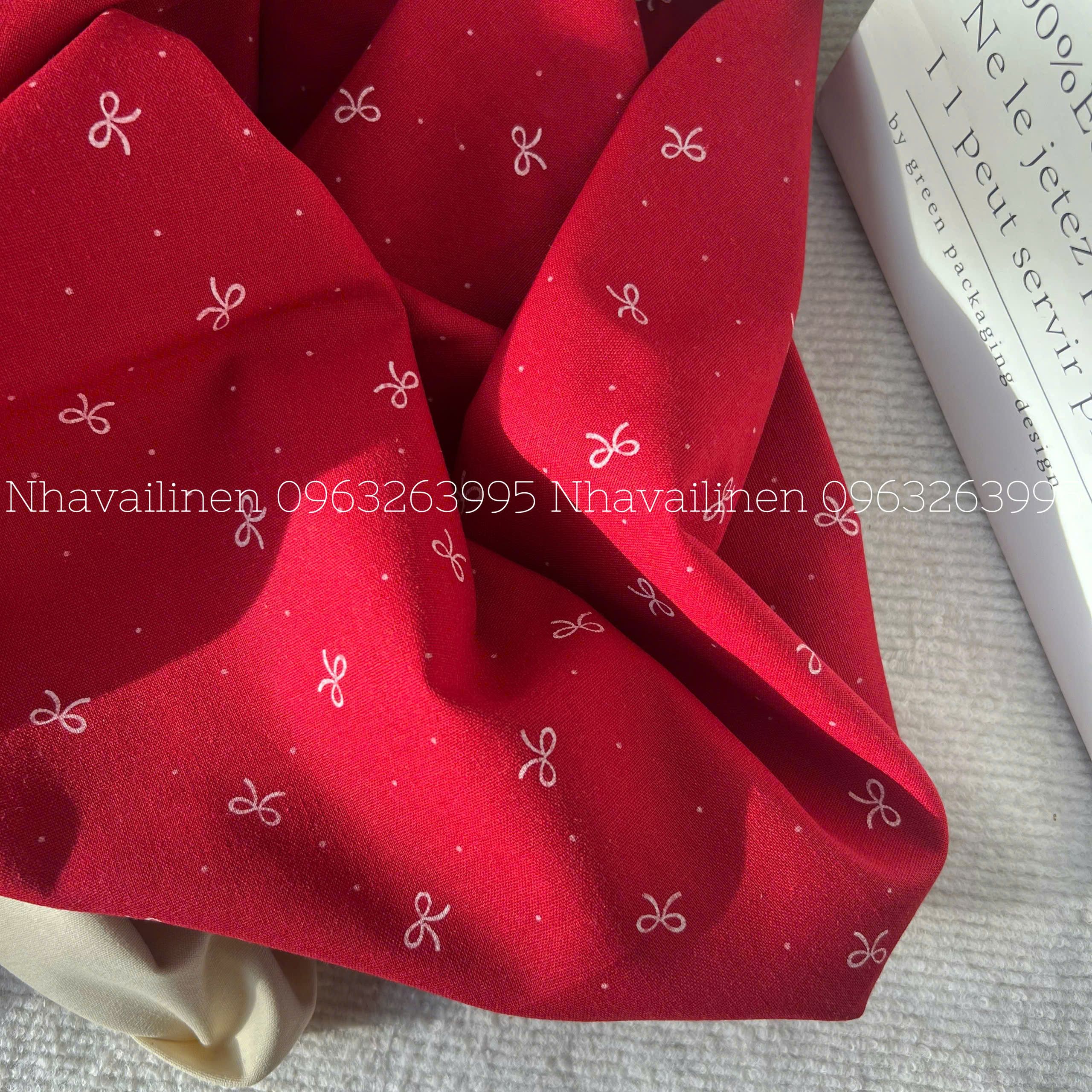 Vải Linen Bột Dày NƠ TRẮNG NỀN ĐỎ Chất Vải Dày Dặn