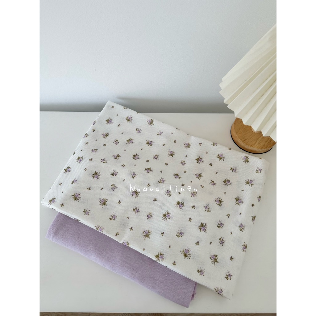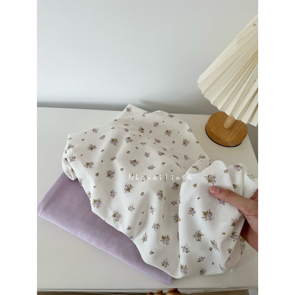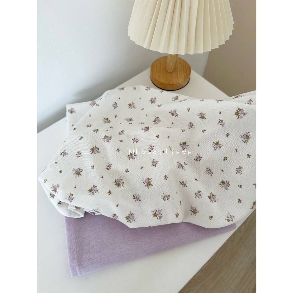 Vải linen bột hoa tím lá xanh