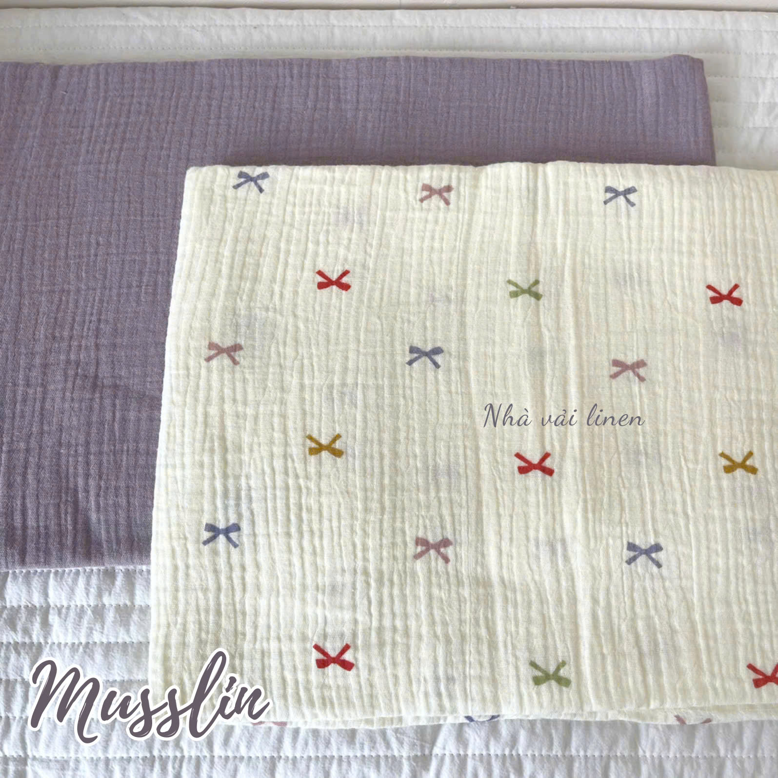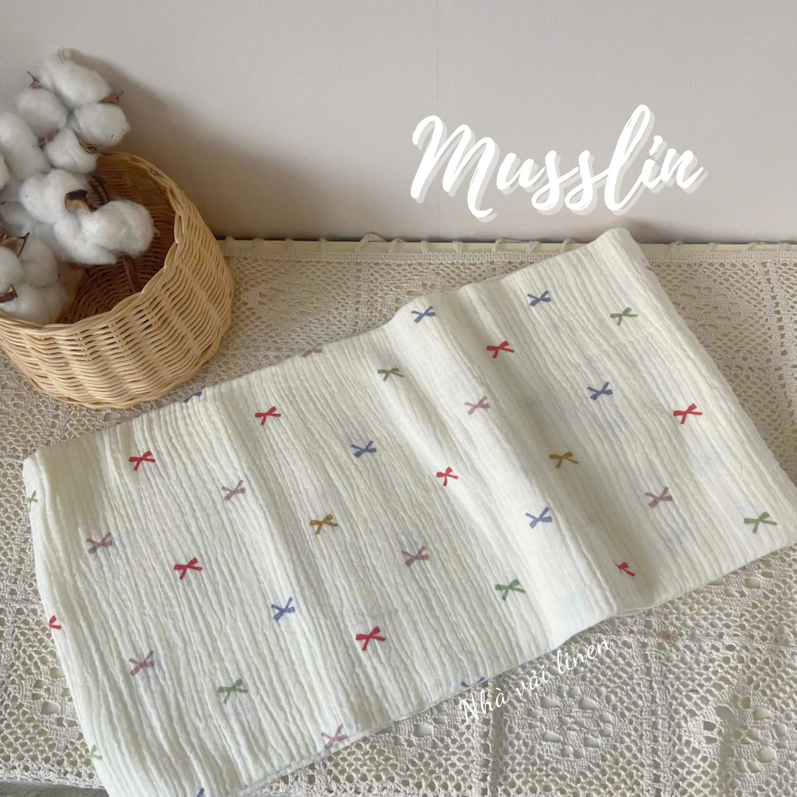 - Chất liệu: Vải Muslin được làm từ sợi cotton tự nhiên.